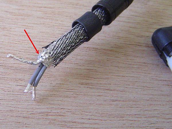 再把這條的外皮剝掉長一些---要與外部屏蔽網短路(焊在一起)